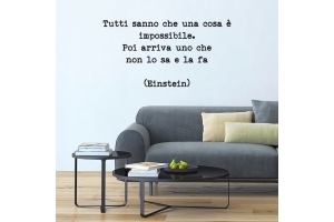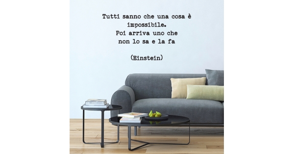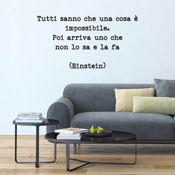PRODOTTI DI ALTA QUALITÀ Scegli l’adesivo “Tutti sanno che una cosa è impossibile” Di-arte: facilissimo da applicare e così sottile da poter essere rimosso in modo semplice, senza lasciar alcun segno sulle superfici.I nostri adesivi, 100% Made in Italy, presentano un’elevata qualità, in quanto prodotti con metodi che prevedono un’alta percentuale di lavoro a mano e materiali ricercati e sempre all’avanguardia.Gli adesivi Di-arte sono ottimi per ogni parete della tua casa o del tuo ufficio: semplici, ma allo stesso tempo di grande effetto per dare un tocco unico alle tue stanze. SCEGLI LA SOLUZIONE PIÙ ADATTA A TE Applica il tuo adesivo dove preferisci, servendoti di una semplice card o carta di credito, utile per farlo attaccare meglio alla superficie, dopo aver scelto dimensioni e colore che più fanno per te. Le nostre dimensioni sono sempre associate al foglio di consegna e indicate come larghezza x altezza. Vorresti comprare l’adesivo murale “Tutti sanno che una cosa è impossibile” ma necessiti di una dimensione o di un colore diverso? Nessun problema, contattaci e cercheremo la soluzione più adatta alle tue esigenze. INDICAZIONI PER L’APPLICAZIONE Grazie all’application tape, pellicola appiccicosa trasparente che viene posta al di sopra dell’adesivo, è possibile, una volta rimossa la carta di supporto, trasferire integralmente, in un’unica soluzione, lo sticker direttamente sul muro.Servendosi di una spatola o anche di una qualsiasi card o carta di credito, dopo aver compiuto un movimento dal centro verso l’esterno, necessario per farlo aderire meglio, è sufficiente rimuovere con cautela la pellicola, sollevandone un bordo e tirando verso l’esterno, e l’adesivo sarà pronto. Hai ancora dubbi sull’applicazione? Segui le istruzioni che ti verranno consegnate con il nostro adesivo e cambia look alla tua casa! I nostri adesivi si adattano perfettamente alle superfici lisce: assicurati, dunque, prima di procedere all’applicazione che essa sia pulita e priva di tracce di polvere.
