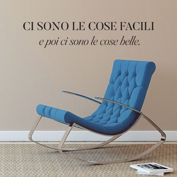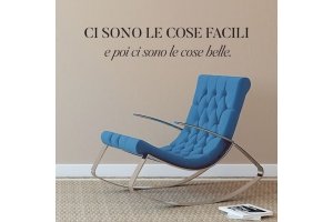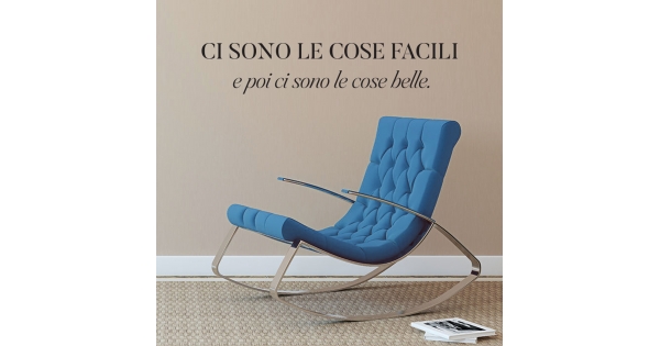 PRODOTTI DI ALTA QUALITÀ Scegli l’adesivo “Ci sono le cose facili” Di-arte: facilissimo da applicare e così sottile da poter essere rimosso in modo semplice, senza lasciar alcun segno sulle superfici.I nostri adesivi, 100% Made in Italy, presentano un’elevata qualità, in quanto prodotti con metodi che prevedono un’alta percentuale di lavoro a mano e materiali ricercati e sempre all’avanguardia.Gli adesivi Di-arte sono ottimi per ogni parete della tua casa o del tuo ufficio: semplici, ma allo stesso tempo di grande effetto per dare un tocco unico alle tue stanze. SCEGLI LA SOLUZIONE PIÙ ADATTA A TE Applica il tuo adesivo dove preferisci, servendoti di una semplice card o carta di credito, utile per farlo attaccare meglio alla superficie, dopo aver scelto dimensioni e colore che più fanno per te. Le nostre dimensioni sono sempre associate al foglio di consegna e indicate come larghezza x altezza. Vorresti comprare l’adesivo murale “Ci sono le cose facili” ma necessiti di una dimensione o di un colore diverso? Nessun problema, contattaci e cercheremo la soluzione più adatta alle tue esigenze. INDICAZIONI PER L’APPLICAZIONE Grazie all’application tape, pellicola appiccicosa trasparente che viene posta al di sopra dell’adesivo, è possibile, una volta rimossa la carta di supporto, trasferire integralmente, in un’unica soluzione, lo sticker direttamente sul muro.Servendosi di una spatola o anche di una qualsiasi card o carta di credito, dopo aver compiuto un movimento dal centro verso l’esterno, necessario per farlo aderire meglio, è sufficiente rimuovere con cautela la pellicola, sollevandone un bordo e tirando verso l’esterno, e l’adesivo sarà pronto. Hai ancora dubbi sull’applicazione? Segui le istruzioni che ti verranno consegnate con il nostro adesivo e cambia look alla tua casa! I nostri adesivi si adattano perfettamente alle superfici lisce: assicurati, dunque, prima di procedere all’applicazione che essa sia pulita e priva di tracce di polvere.