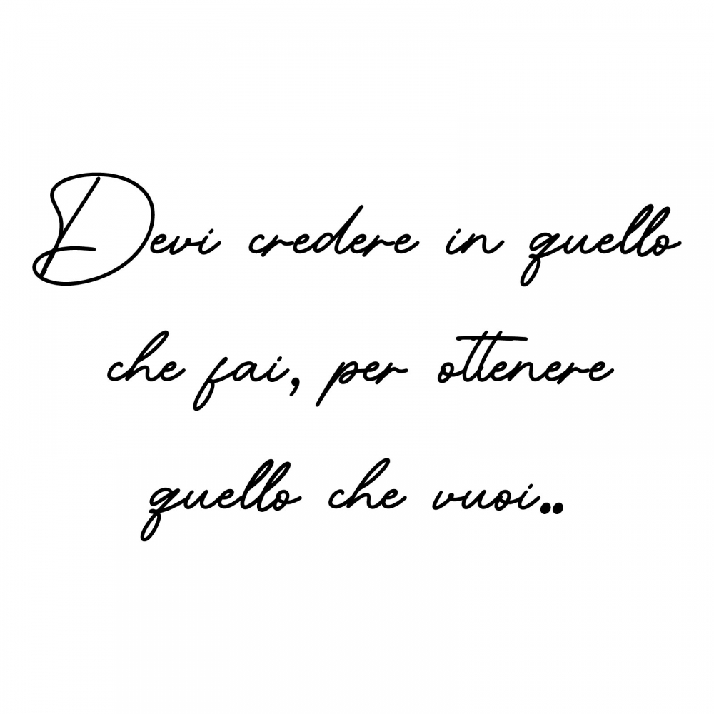 PRODOTTI DI ALTA QUALITÀ Scegli l’adesivo “Devi credere in quello che fai” Di-arte: facilissimo da applicare e così sottile da poter essere rimosso in modo semplice, senza lasciar alcun segno sulle superfici.I nostri adesivi, 100% Made in Italy, presentano un’elevata qualità, in quanto prodotti con metodi che prevedono un’alta percentuale di lavoro a mano e materiali ricercati e sempre all’avanguardia.Gli adesivi Di-arte sono ottimi per ogni parete della tua casa o del tuo ufficio: semplici, ma allo stesso tempo di grande effetto per dare un tocco unico alle tue stanze. SCEGLI LA SOLUZIONE PIÙ ADATTA A TE Applica il tuo adesivo dove preferisci, servendoti di una semplice card o carta di credito, utile per farlo attaccare meglio alla superficie, dopo aver scelto dimensioni e colore che più fanno per te. Le nostre dimensioni sono sempre associate al foglio di consegna e indicate come larghezza x altezza. Vorresti comprare l’adesivo murale “Devi credere in quello che fai” ma necessiti di una dimensione o di un colore diverso? Nessun problema, contattaci e cercheremo la soluzione più adatta alle tue esigenze. INDICAZIONI PER L’APPLICAZIONE Grazie all’application tape, pellicola appiccicosa trasparente che viene posta al di sopra dell’adesivo, è possibile, una volta rimossa la carta di supporto, trasferire integralmente, in un’unica soluzione, lo sticker direttamente sul muro.Servendosi di una spatola o anche di una qualsiasi card o carta di credito, dopo aver compiuto un movimento dal centro verso l’esterno, necessario per farlo aderire meglio, è sufficiente rimuovere con cautela la pellicola, sollevandone un bordo e tirando verso l’esterno, e l’adesivo sarà pronto. Hai ancora dubbi sull’applicazione? Segui le istruzioni che ti verranno consegnate con il nostro adesivo e cambia look alla tua casa! I nostri adesivi si adattano perfettamente alle superfici lisce: assicurati, dunque, prima di procedere all’applicazione che essa sia pulita e priva di tracce di polvere.
