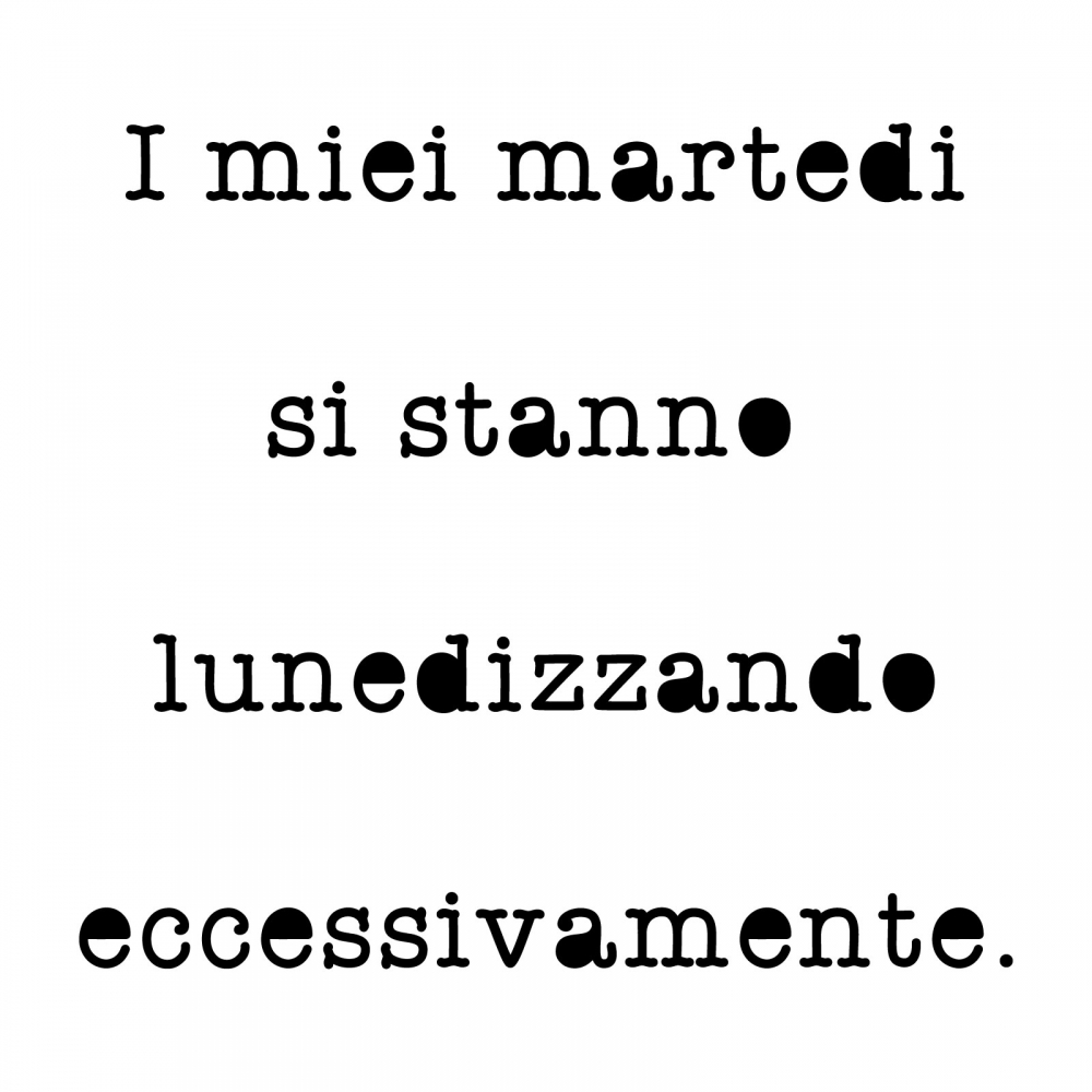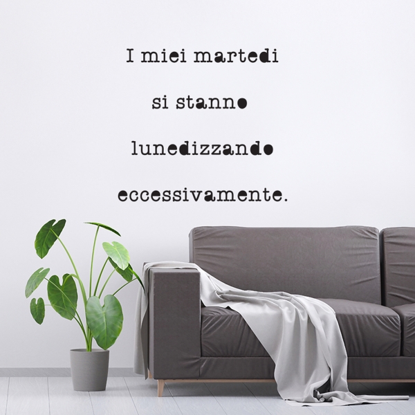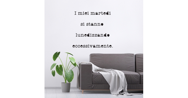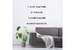 PRODOTTI DI ALTA QUALITÀ Scegli l’adesivo “I miei martedì” Di-arte: facilissimo da applicare e così sottile da poter essere rimosso in modo semplice, senza lasciar alcun segno sulle superfici.I nostri adesivi, 100% Made in Italy, presentano un’elevata qualità, in quanto prodotti con metodi che prevedono un’alta percentuale di lavoro a mano e materiali ricercati e sempre all’avanguardia.Gli adesivi Di-arte sono ottimi per ogni parete della tua casa o del tuo ufficio: semplici, ma allo stesso tempo di grande effetto per dare un tocco unico alle tue stanze. SCEGLI LA SOLUZIONE PIÙ ADATTA A TE Applica il tuo adesivo dove preferisci, servendoti di una semplice card o carta di credito, utile per farlo attaccare meglio alla superficie, dopo aver scelto dimensioni e colore che più fanno per te. Le nostre dimensioni sono sempre associate al foglio di consegna e indicate come larghezza x altezza. Vorresti comprare l’adesivo murale “I miei martedì” ma necessiti di una dimensione o di un colore diverso? Nessun problema, contattaci e cercheremo la soluzione più adatta alle tue esigenze. INDICAZIONI PER L’APPLICAZIONE Grazie all’application tape, pellicola appiccicosa trasparente che viene posta al di sopra dell’adesivo, è possibile, una volta rimossa la carta di supporto, trasferire integralmente, in un’unica soluzione, lo sticker direttamente sul muro.Servendosi di una spatola o anche di una qualsiasi card o carta di credito, dopo aver compiuto un movimento dal centro verso l’esterno, necessario per farlo aderire meglio, è sufficiente rimuovere con cautela la pellicola, sollevandone un bordo e tirando verso l’esterno, e l’adesivo sarà pronto. Hai ancora dubbi sull’applicazione? Segui le istruzioni che ti verranno consegnate con il nostro adesivo e cambia look alla tua casa! I nostri adesivi si adattano perfettamente alle superfici lisce: assicurati, dunque, prima di procedere all’applicazione che essa sia pulita e priva di tracce di polvere.