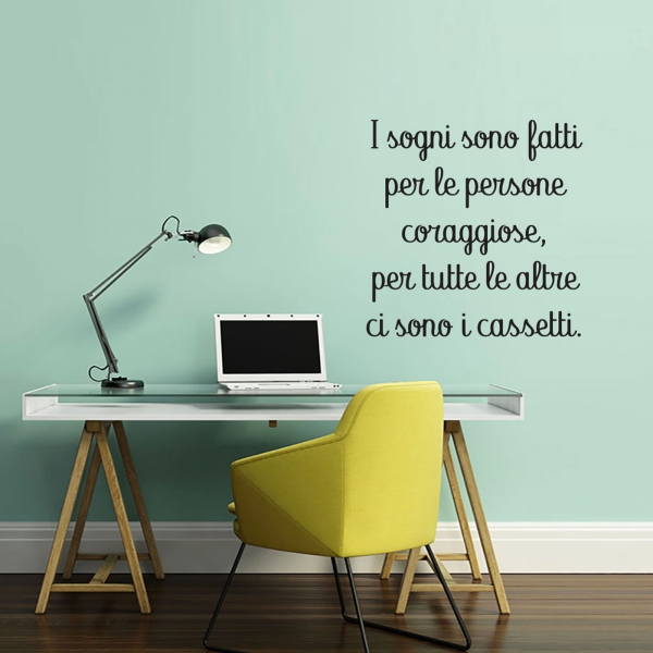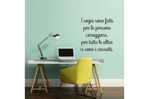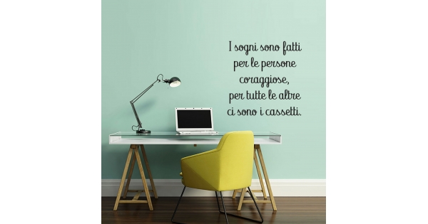 PRODOTTI DI ALTA QUALITÀ Scegli l’adesivo “I sogni sono fatti per le persone coraggiose” Di-arte: facilissimo da applicare e così sottile da poter essere rimosso in modo semplice, senza lasciar alcun segno sulle superfici.I nostri adesivi, 100% Made in Italy, presentano un’elevata qualità, in quanto prodotti con metodi che prevedono un’alta percentuale di lavoro a mano e materiali ricercati e sempre all’avanguardia.Gli adesivi Di-arte sono ottimi per ogni parete della tua casa o del tuo ufficio: semplici, ma allo stesso tempo di grande effetto per dare un tocco unico alle tue stanze. SCEGLI LA SOLUZIONE PIÙ ADATTA A TE Applica il tuo adesivo dove preferisci, servendoti di una semplice card o carta di credito, utile per farlo attaccare meglio alla superficie, dopo aver scelto dimensioni e colore che più fanno per te. Le nostre dimensioni sono sempre associate al foglio di consegna e indicate come larghezza x altezza. Vorresti comprare l’adesivo murale “I sogni sono fatti per le persone coraggiose” ma necessiti di una dimensione o di un colore diverso? Nessun problema, contattaci e cercheremo la soluzione più adatta alle tue esigenze. INDICAZIONI PER L’APPLICAZIONE Grazie all’application tape, pellicola appiccicosa trasparente che viene posta al di sopra dell’adesivo, è possibile, una volta rimossa la carta di supporto, trasferire integralmente, in un’unica soluzione, lo sticker direttamente sul muro.Servendosi di una spatola o anche di una qualsiasi card o carta di credito, dopo aver compiuto un movimento dal centro verso l’esterno, necessario per farlo aderire meglio, è sufficiente rimuovere con cautela la pellicola, sollevandone un bordo e tirando verso l’esterno, e l’adesivo sarà pronto. Hai ancora dubbi sull’applicazione? Segui le istruzioni che ti verranno consegnate con il nostro adesivo e cambia look alla tua casa! I nostri adesivi si adattano perfettamente alle superfici lisce: assicurati, dunque, prima di procedere all’applicazione che essa sia pulita e priva di tracce di polvere.