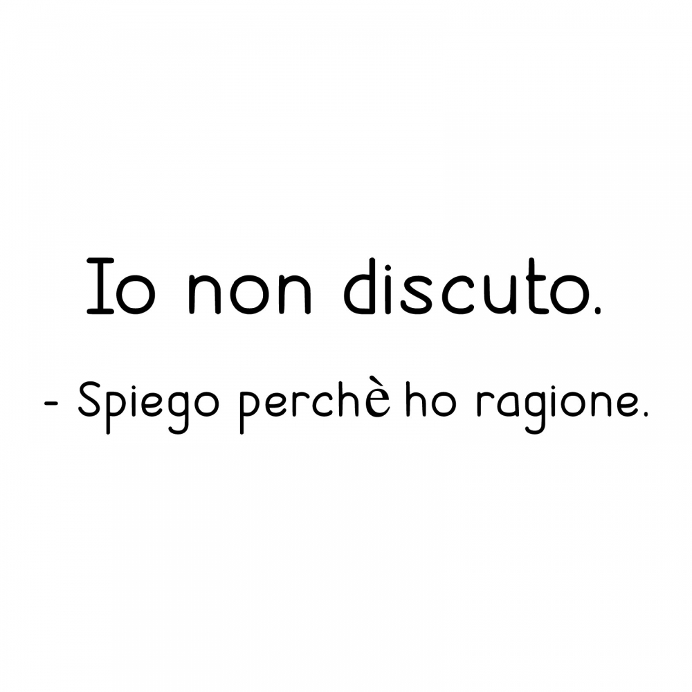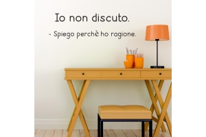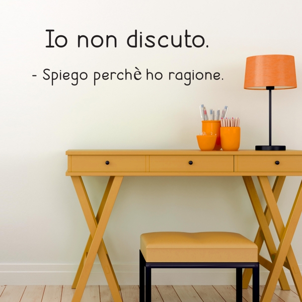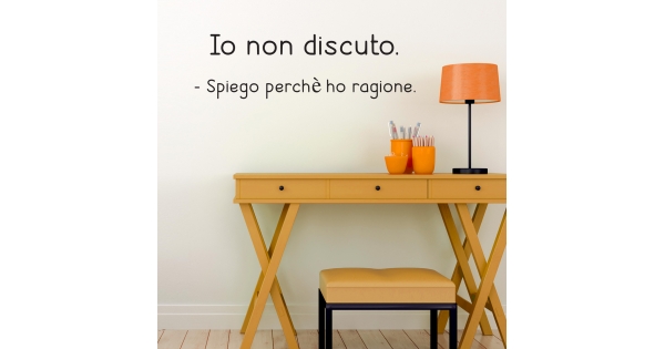 PRODOTTI DI ALTA QUALITÀ Scegli l’adesivo “Io non discuto” Di-arte: facilissimo da applicare e così sottile da poter essere rimosso in modo semplice, senza lasciar alcun segno sulle superfici.I nostri adesivi, 100% Made in Italy, presentano un’elevata qualità, in quanto prodotti con metodi che prevedono un’alta percentuale di lavoro a mano e materiali ricercati e sempre all’avanguardia.Gli adesivi Di-arte sono ottimi per ogni parete della tua casa o del tuo ufficio: semplici, ma allo stesso tempo di grande effetto per dare un tocco unico alle tue stanze. SCEGLI LA SOLUZIONE PIÙ ADATTA A TE Applica il tuo adesivo dove preferisci, servendoti di una semplice card o carta di credito, utile per farlo attaccare meglio alla superficie, dopo aver scelto dimensioni e colore che più fanno per te. Le nostre dimensioni sono sempre associate al foglio di consegna e indicate come larghezza x altezza. Vorresti comprare l’adesivo murale “Io non discuto” ma necessiti di una dimensione o di un colore diverso? Nessun problema, contattaci e cercheremo la soluzione più adatta alle tue esigenze. INDICAZIONI PER L’APPLICAZIONE Grazie all’application tape, pellicola appiccicosa trasparente che viene posta al di sopra dell’adesivo, è possibile, una volta rimossa la carta di supporto, trasferire integralmente, in un’unica soluzione, lo sticker direttamente sul muro.Servendosi di una spatola o anche di una qualsiasi card o carta di credito, dopo aver compiuto un movimento dal centro verso l’esterno, necessario per farlo aderire meglio, è sufficiente rimuovere con cautela la pellicola, sollevandone un bordo e tirando verso l’esterno, e l’adesivo sarà pronto. Hai ancora dubbi sull’applicazione? Segui le istruzioni che ti verranno consegnate con il nostro adesivo e cambia look alla tua casa! I nostri adesivi si adattano perfettamente alle superfici lisce: assicurati, dunque, prima di procedere all’applicazione che essa sia pulita e priva di tracce di polvere.