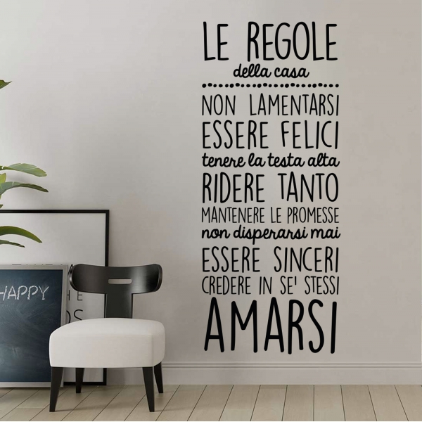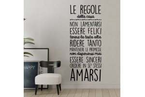 SCEGLI LA SOLUZIONE PIÙ ADATTA A TE Applica i nostri adesivi dove preferisci, senza bisogno di alcun strumento, oppure utilizzando una semplice card o carta di credito per garantire una perfetta adesione alla superficie.Le dimensioni dei nostri prodotti sono sempre indicate come larghezza x altezza e sono sempre associate al foglio che arriverà insieme alla spedizione. L’adesivo murale “Le regole della casa” ti piace ma non presenta le dimensioni o i colori adatti a te? Contattaci e cercheremo di accontentare le tue richieste.