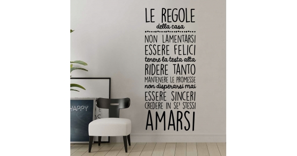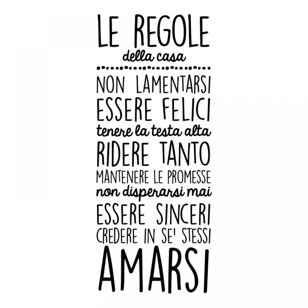 PRODOTTI DI ALTA QUALITÀ Scegli l’adesivo “Le regole della casa” Di-arte: semplicissimo da applicare e così sottile che si stacca banalmente, lasciando le superfici come nuove.I nostri adesivi, 100% Made in Italy, presentano un’altissima qualità, poiché sono realizzati attraverso tecniche basate su un’alta percentuale di lavoro a mano e con materiali ricercati e sempre all’avanguardia.Gli adesivi Di-arte sono adatti a qualsiasi zona della tua casa o del tuo ufficio: la loro semplicità garantisce un tocco unico nonché di grande impatto alle tue pareti.