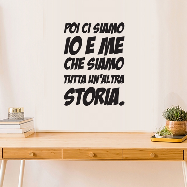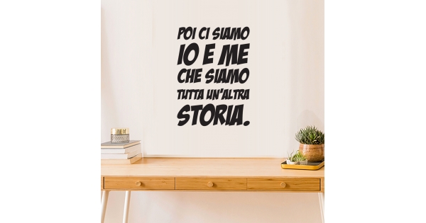 PRODOTTI DI ALTA QUALITÀ Scegli l’adesivo “Poi ci siamo io e me” Di-arte: facilissimo da applicare e così sottile da poter essere rimosso in modo semplice, senza lasciar alcun segno sulle superfici.I nostri adesivi, 100% Made in Italy, presentano un’elevata qualità, in quanto prodotti con metodi che prevedono un’alta percentuale di lavoro a mano e materiali ricercati e sempre all’avanguardia.Gli adesivi Di-arte sono ottimi per ogni parete della tua casa o del tuo ufficio: semplici, ma allo stesso tempo di grande effetto per dare un tocco unico alle tue stanze. SCEGLI LA SOLUZIONE PIÙ ADATTA A TE Applica il tuo adesivo dove preferisci, servendoti di una semplice card o carta di credito, utile per farlo attaccare meglio alla superficie, dopo aver scelto dimensioni e colore che più fanno per te. Le nostre dimensioni sono sempre associate al foglio di consegna e indicate come larghezza x altezza. Vorresti comprare l’adesivo murale “Poi ci siamo io e me” ma necessiti di una dimensione o di un colore diverso? Nessun problema, contattaci e cercheremo la soluzione più adatta alle tue esigenze. INDICAZIONI PER L’APPLICAZIONE Grazie all’application tape, pellicola appiccicosa trasparente che viene posta al di sopra dell’adesivo, è possibile, una volta rimossa la carta di supporto, trasferire integralmente, in un’unica soluzione, lo sticker direttamente sul muro.Servendosi di una spatola o anche di una qualsiasi card o carta di credito, dopo aver compiuto un movimento dal centro verso l’esterno, necessario per farlo aderire meglio, è sufficiente rimuovere con cautela la pellicola, sollevandone un bordo e tirando verso l’esterno, e l’adesivo sarà pronto. Hai ancora dubbi sull’applicazione? Segui le istruzioni che ti verranno consegnate con il nostro adesivo e cambia look alla tua casa! I nostri adesivi si adattano perfettamente alle superfici lisce: assicurati, dunque, prima di procedere all’applicazione che essa sia pulita e priva di tracce di polvere.