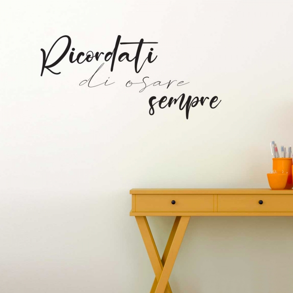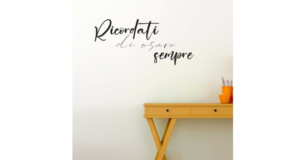 PRODOTTI DI ALTA QUALITÀ Scegli l’adesivo “Ricordati di Osare Sempre” Di-arte: semplicissimo da applicare e così sottile che si stacca banalmente, lasciando le superfici come nuove.I nostri adesivi, 100% Made in Italy, presentano un’altissima qualità, poiché sono realizzati attraverso tecniche basate su un’alta percentuale di lavoro a mano e con materiali ricercati e sempre all’avanguardia.Gli adesivi Di-arte sono adatti a qualsiasi zona della tua casa o del tuo ufficio: la loro semplicità garantisce un tocco unico nonché di grande impatto alle tue pareti.
