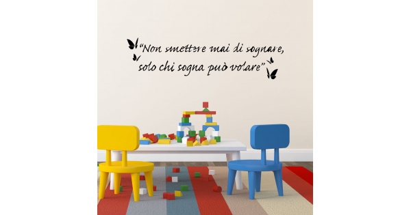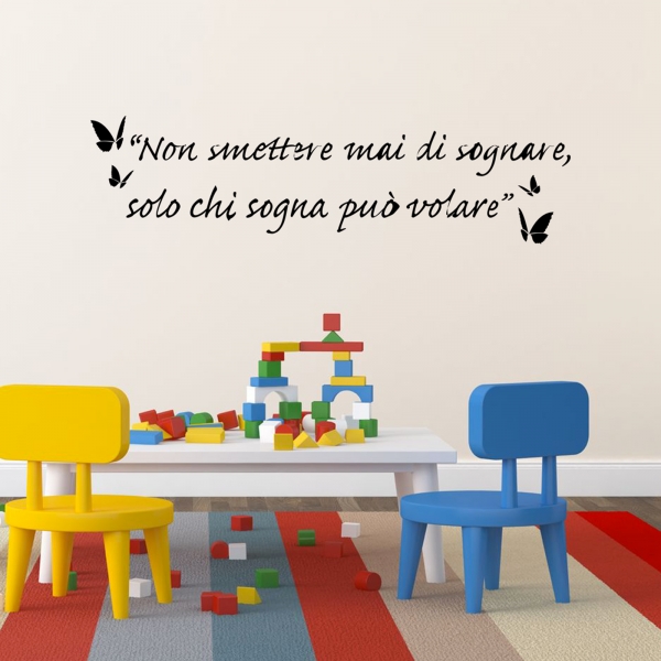 Delicate farfalle accompagnano questa frase ideale per la stanza dei bimbi, perché crescano felici e sicuri e non dimentichino di credere nei sogni.
