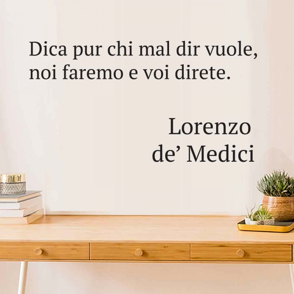 PRODOTTI DI ALTA QUALITÀ Scegli l’adesivo “Dica pur chi mal dir vuole” Di-arte: facilissimo da applicare e così sottile da poter essere rimosso in modo semplice, senza lasciar alcun segno sulle superfici.I nostri adesivi, 100% Made in Italy, presentano un’elevata qualità, in quanto prodotti con metodi che prevedono un’alta percentuale di lavoro a mano e materiali ricercati e sempre all’avanguardia.Gli adesivi Di-arte sono ottimi per ogni parete della tua casa o del tuo ufficio: semplici, ma allo stesso tempo di grande effetto per dare un tocco unico alle tue stanze. SCEGLI LA SOLUZIONE PIÙ ADATTA A TE Applica il tuo adesivo dove preferisci, servendoti di una semplice card o carta di credito, utile per farlo attaccare meglio alla superficie, dopo aver scelto dimensioni e colore che più fanno per te. Le nostre dimensioni sono sempre associate al foglio di consegna e indicate come larghezza x altezza. Vorresti comprare l’adesivo murale “Dica pur chi mal dir vuole” ma necessiti di una dimensione o di un colore diverso? Nessun problema, contattaci e cercheremo la soluzione più adatta alle tue esigenze. INDICAZIONI PER L’APPLICAZIONE Grazie all’application tape, pellicola appiccicosa trasparente che viene posta al di sopra dell’adesivo, è possibile, una volta rimossa la carta di supporto, trasferire integralmente, in un’unica soluzione, lo sticker direttamente sul muro.Servendosi di una spatola o anche di una qualsiasi card o carta di credito, dopo aver compiuto un movimento dal centro verso l’esterno, necessario per farlo aderire meglio, è sufficiente rimuovere con cautela la pellicola, sollevandone un bordo e tirando verso l’esterno, e l’adesivo sarà pronto. Hai ancora dubbi sull’applicazione? Segui le istruzioni che ti verranno consegnate con il nostro adesivo e cambia look alla tua casa! I nostri adesivi si adattano perfettamente alle superfici lisce: assicurati, dunque, prima di procedere all’applicazione che essa sia pulita e priva di tracce di polvere.