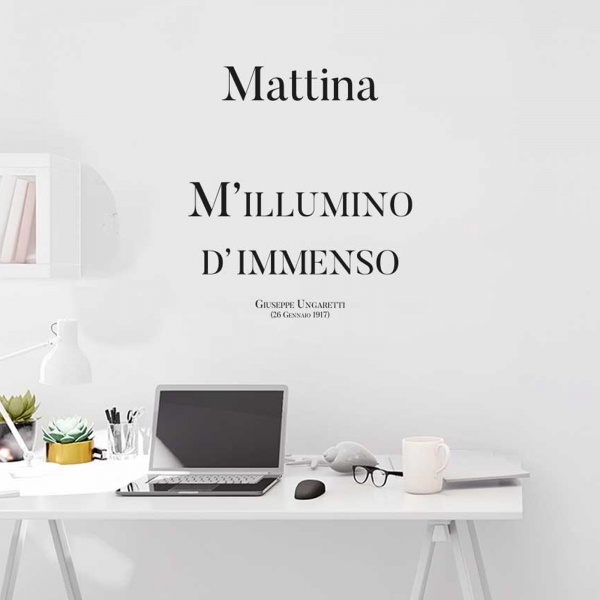 PRODOTTI DI ALTA QUALITÀ Scegli l’adesivo “Mattina m'illumino d'immenso” Di-arte: facilissimo da applicare e così sottile da poter essere rimosso in modo semplice, senza lasciar alcun segno sulle superfici.I nostri adesivi, 100% Made in Italy, presentano un’elevata qualità, in quanto prodotti con metodi che prevedono un’alta percentuale di lavoro a mano e materiali ricercati e sempre all’avanguardia.Gli adesivi Di-arte sono ottimi per ogni parete della tua casa o del tuo ufficio: semplici, ma allo stesso tempo di grande effetto per dare un tocco unico alle tue stanze. SCEGLI LA SOLUZIONE PIÙ ADATTA A TE Applica il tuo adesivo dove preferisci, servendoti di una semplice card o carta di credito, utile per farlo attaccare meglio alla superficie, dopo aver scelto dimensioni e colore che più fanno per te. Le nostre dimensioni sono sempre associate al foglio di consegna e indicate come larghezza x altezza. Vorresti comprare l’adesivo murale “Mattina m'illumino d'immenso” ma necessiti di una dimensione o di un colore diverso? Nessun problema, contattaci e cercheremo la soluzione più adatta alle tue esigenze. INDICAZIONI PER L’APPLICAZIONE Grazie all’application tape, pellicola appiccicosa trasparente che viene posta al di sopra dell’adesivo, è possibile, una volta rimossa la carta di supporto, trasferire integralmente, in un’unica soluzione, lo sticker direttamente sul muro.Servendosi di una spatola o anche di una qualsiasi card o carta di credito, dopo aver compiuto un movimento dal centro verso l’esterno, necessario per farlo aderire meglio, è sufficiente rimuovere con cautela la pellicola, sollevandone un bordo e tirando verso l’esterno, e l’adesivo sarà pronto. Hai ancora dubbi sull’applicazione? Segui le istruzioni che ti verranno consegnate con il nostro adesivo e cambia look alla tua casa! I nostri adesivi si adattano perfettamente alle superfici lisce: assicurati, dunque, prima di procedere all’applicazione che essa sia pulita e priva di tracce di polvere.