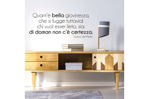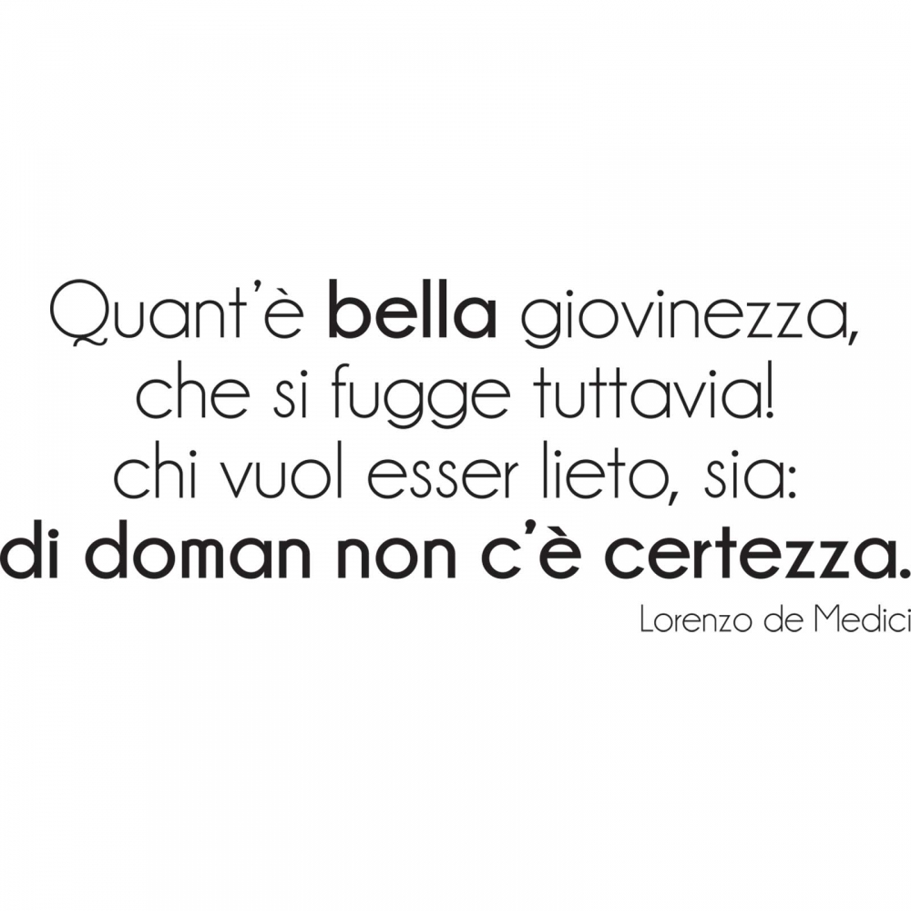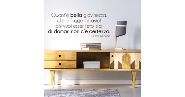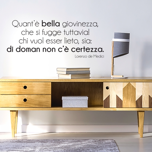 PRODOTTI DI ALTA QUALITÀ Scegli l'adesivo “Quant'è bella giovinezza” Di-arte: facilissimo da applicare e così sottile da poter essere rimosso in modo semplice, senza lasciare alcun segno sulle superfici.I nostri adesivi, 100% Made in Italy, presentano un'elevata qualità, in quanto prodotti con metodi che prevedono un'alta percentuale di lavoro a mano e materiali ricercati e sempre all'avanguardia.Gli adesivi Di-arte sono ottimi per ogni parete della tua casa o del tuo ufficio: semplici, ma allo stesso tempo di grande effetto per dare un tocco unico alle tue stanze. SCEGLI LA SOLUZIONE PIÙ ADATTA A TE Applica il tuo adesivo dove preferisci, servendoti di una semplice carta o carta di credito, utile per farlo attaccare meglio alla superficie, dopo aver scelto dimensioni e colore che più fanno per te. Le nostre dimensioni sono sempre associate al foglio di consegna e indicano come larghezza x altezza. Vorresti comprare l'adesivo murale “Quant'è bella giovinezza” ma necessità di una dimensione o di un colore diverso? Nessun problema, contattaci e cercheremo la soluzione più adatta alle tue esigenze. INDICAZIONI PER L'APPLICAZIONE Grazie all'application tape, pellicola appiccicosa trasparente che viene posta al di sopra dell'adesivo, è possibile, una volta rimossa la carta di supporto, trasferire integralmente, in un'unica soluzione, lo adesivo direttamente sul muro.Servendosi di una spatola o anche di una qualsiasi carta o carta di credito, dopo aver compiuto un movimento dal centro verso l'esterno, è necessario per farlo aderire meglio, è sufficiente rimuovere con custodia la pellicola, sollevandone un bordo e tirando verso l'esterno, e l'adesivo sarà pronto. Hai ancora dubbi sull'applicazione? Segui le istruzioni che ti verranno consegnate con il nostro adesivo e cambia look alla tua casa! I nostri adesivi si adattano perfettamente alle superfici lisce: assicurati, dunque, prima di procedere all'applicazione che essa sia pulita e priva di tracce di polvere. Inoltre, è opportuno aspettare circa 3-4 settimane prima di attaccare lo adesivo sulle pareti appena dipinte.