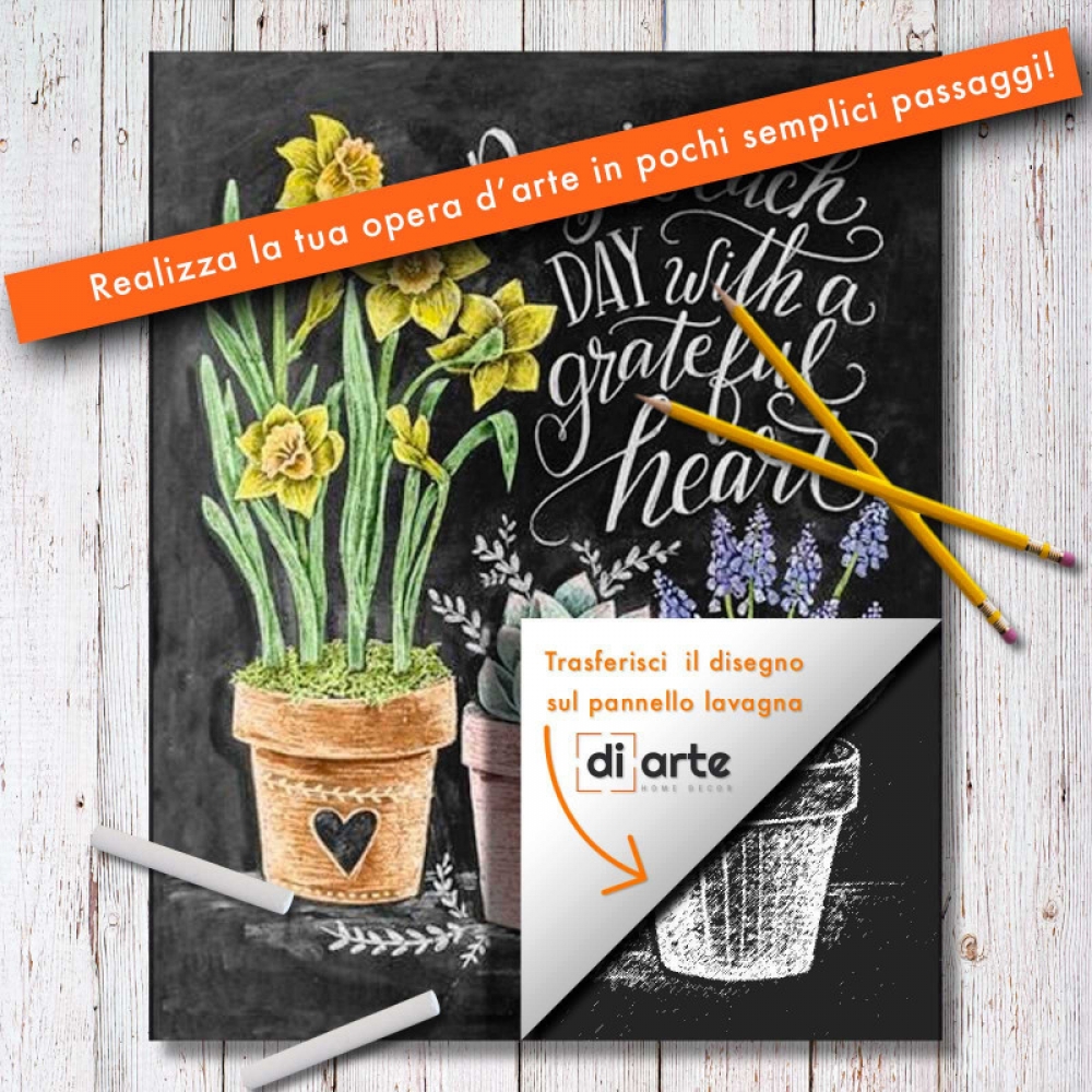 Oltre alla possibilità di selezionare diverse dimensioni in base ai tuoi spazi e alle tue esigenze, il pannello decorativo Chalkboard Art “Grateful Heart” è pensato per chi desidera esprimere la propria creatività in modo semplice e intuitivo.