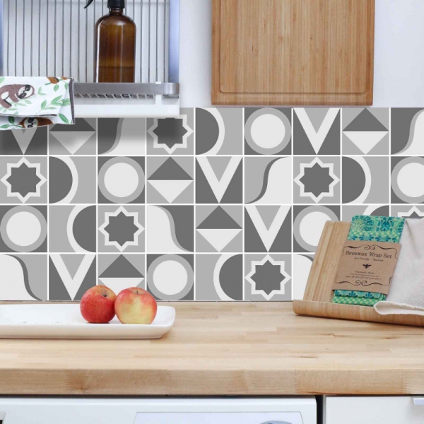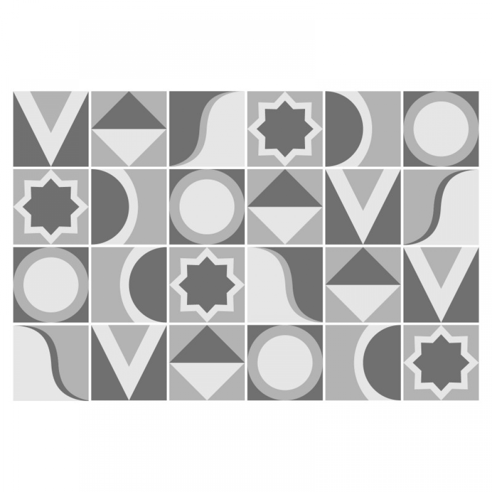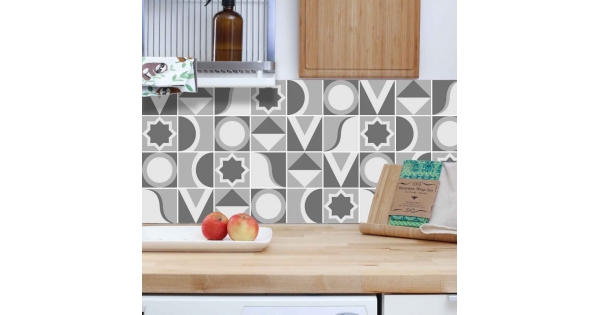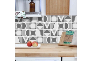 Decorazione adesiva per piastrelle in vari formati.